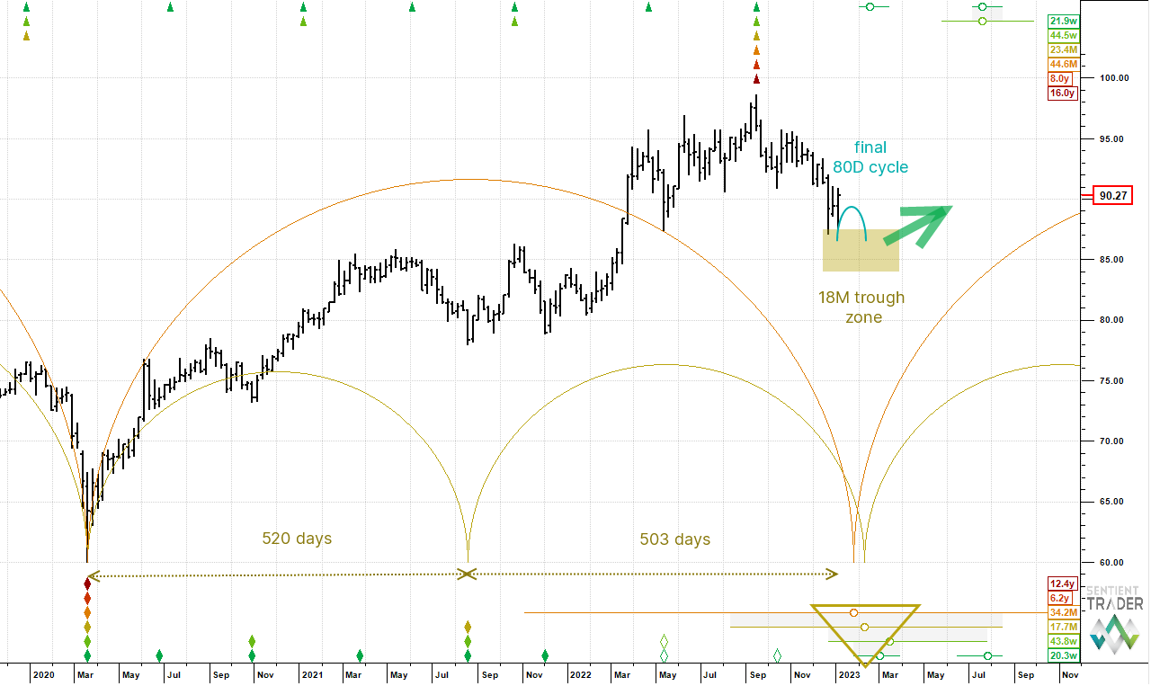 The Australian Dollar - Japanese Yen pair exhibits very clear long term-cycles, both when considering cycles synchronized at their troughs and at their peaks which makes it an unusual and interesting pair to analyze - most instruments are clearly trough or peak synchronized. The high magnitude peak that formed at the end of September 2022, in common with many other forex pairs - see the stack of triangles at the top of the above chart - is possibly of 18 year magnitude, although assuming such high magnitude after only a few months is premature. We will certainly be watching the nature of the bounce out of the upcoming trough in this pair for confirmation of that peak magnitude.