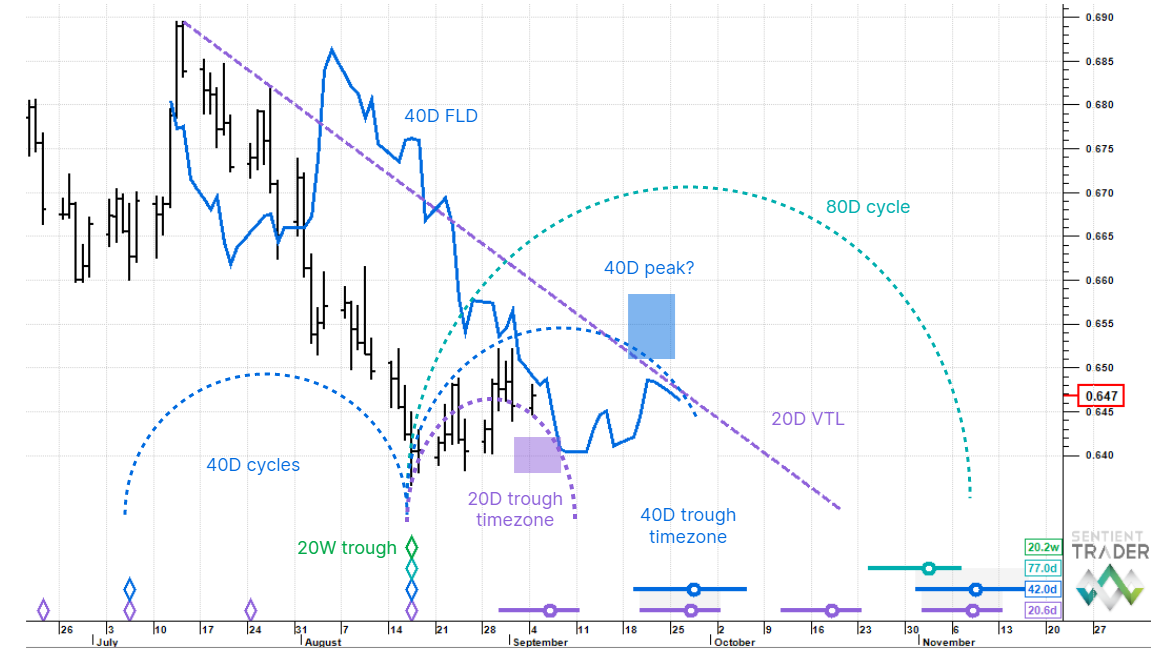 The 17 August price low is at least a 20 week cycle trough and this cycle is now rising and informing the broader uptrend. We are tracking the first 40 day cycle out of this towards the blue target box just after mid-September. We are expecting a shallow price slump into the 20 day cycle trough this week and then a rebound and upside penetration of the 40 day FLD. The projection out of this crossover is for 0.66, but we have put a more conservative lower boundary to the blue target box (the falling 20 day VTL).