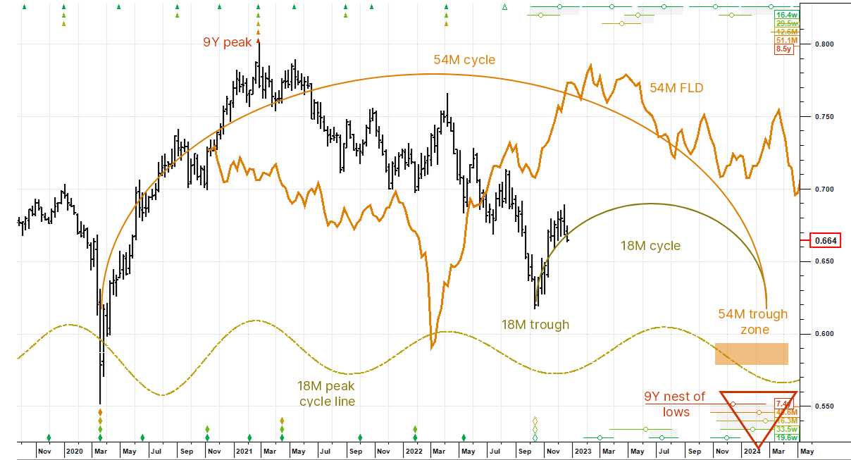 Long view: a secular downtrend is underway and not expected to end until 2024 when the 7 year cycle bottoms. In strong underlying downtrends, shorter cycles tend to peak early. We will therefore start watching for a peak in the current 18 month cycle upswing keenly.