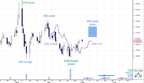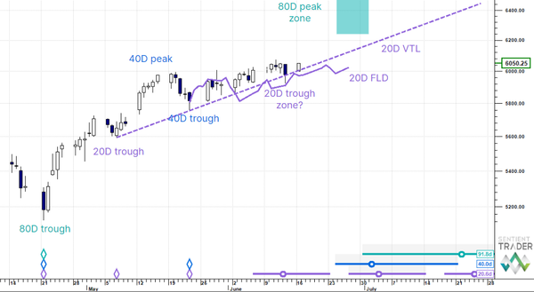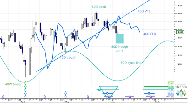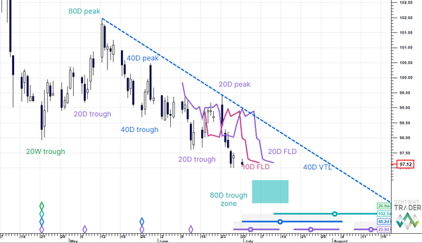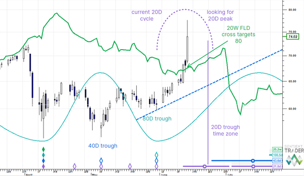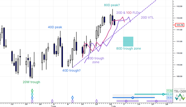 The US Dollar still looks heavy and price is being sucked down into an 80 day cycle low. S&P500 futures could very well be setting up for a burst higher. Oil is approaching a natural intermediate target around 80. Bitcoin is pushing tactically but a big trough is looming ahead ...