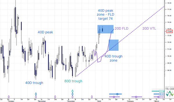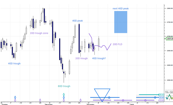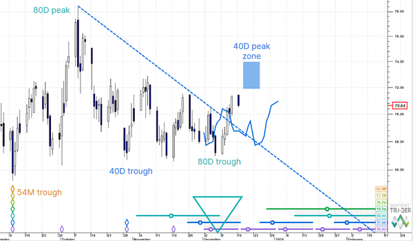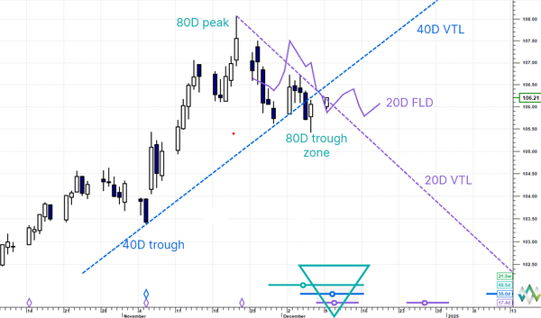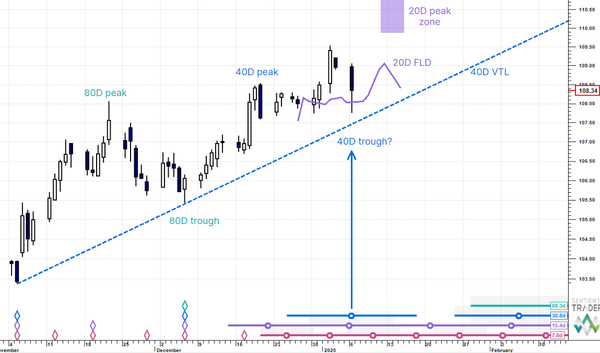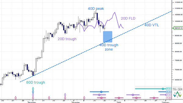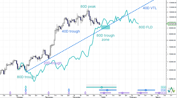 The key index to watch is the US Dollar - potentially emerging from an 80 day cycle trough (together with USDJPY). Gold's 40 day cycle looks heavy, Oil is testing an 80 day cycle low, S&P500 futures look to have more upside play, Bitcoin still has legs ...