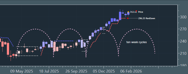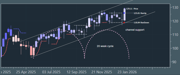 US Dollar Up (20W trough). Gold SmallUp to Down(20D trough). Oil Down (->40D trough). Copper Up (80D trough). EURUSD Up (->40D peak). SPX E-minis SmallDown (-> 20D trough). Nikkei Down (-> 20D trough). Bitcoin Down (-80D trough). Ten Year Notes Up (->40D peak). ...