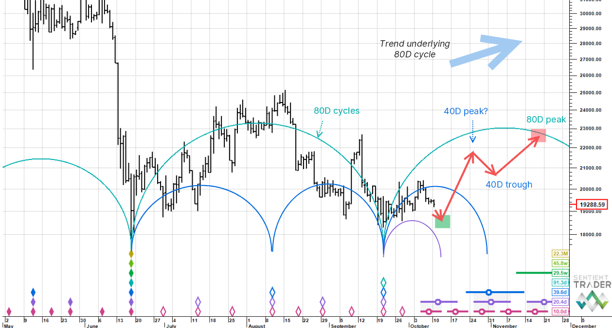 Because the June low was a trough of the 18 month cycle it means that a very long cycle is rising and that the underlying trend is strongly up (similar to Gold, with which Bitcoin is correlated). This should assist the 40 day cycle advance and beyond. We then expect a shallow pullback (because of strong uptrend component baked in) into the first 40 day cycle trough in the first week of November and then further upside. The red arrows describe the preferred trajectory.