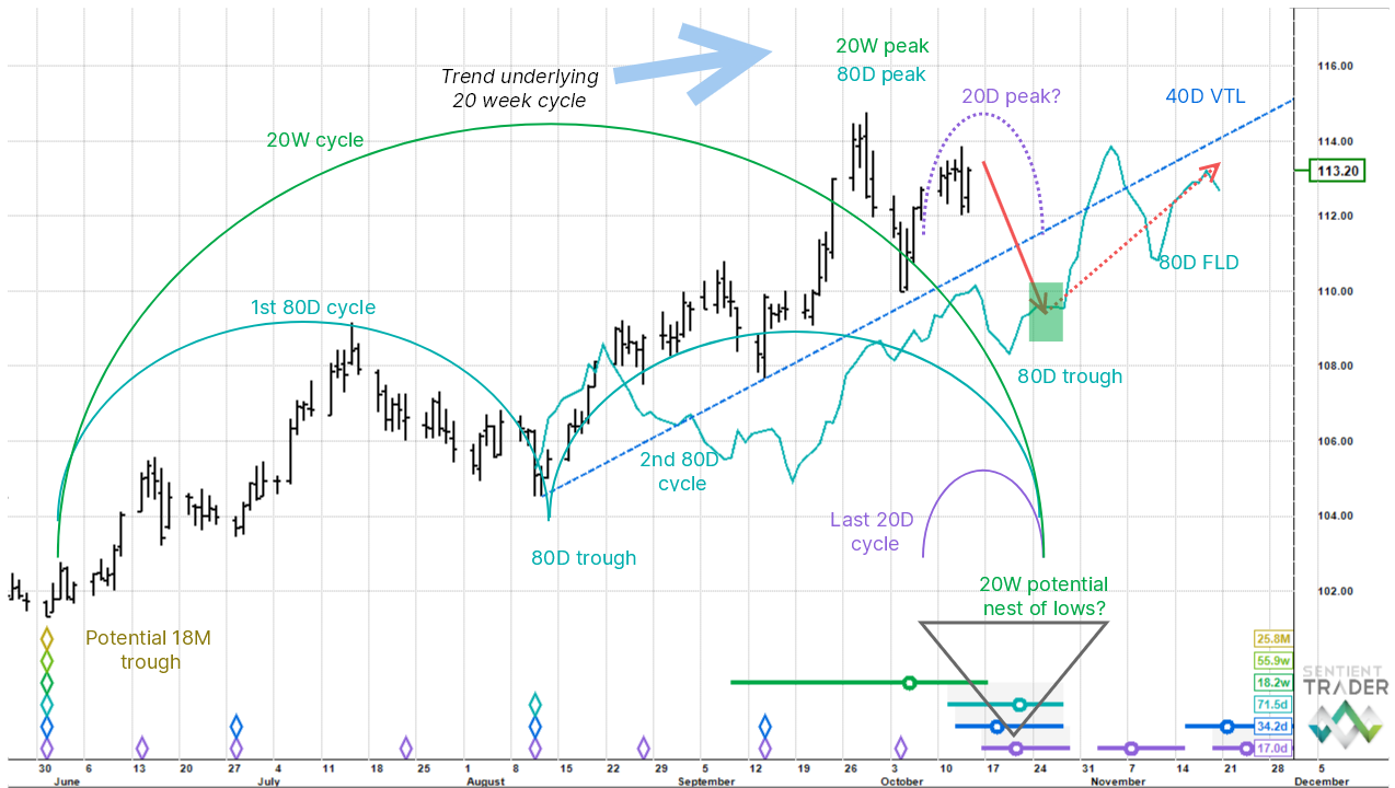 The current 80 day cycle as well as the 20 week cycle both likely topped on 29 September. Their status is therefore down and the next trough for both cycles of is due in the last week of October. It is likely that the 18 month cycle troughed in June and, if so, this cycle is still rising and implies that the broad underlying trend is up. Therefore, once the current cycles of interest bottom, we expect an uptrend re-join. Both the 40 day VTL (valid trendline) and 80 day FLD (forward line of demarcation) have been plotted - see guidance notes. A penetration of the darker blue upsloping VTL line around 111.5 confirms the 80 day cycle peak and the lighter blue FLD should serve as support nearer the time circa 109. The red arrows show a potential price path.
