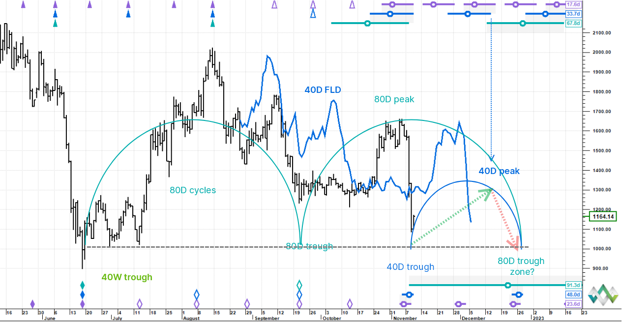 Key levels to watch: (1) 10 day FLD circa 1,220 projects to 1,320. Short FLDs can be traps, so some caution needed, but its a reasonable first aiming point for a potential upside cascade; (2) price could push down to 1,005 / 1,010 and still allow 40 day cycle trough to be called.