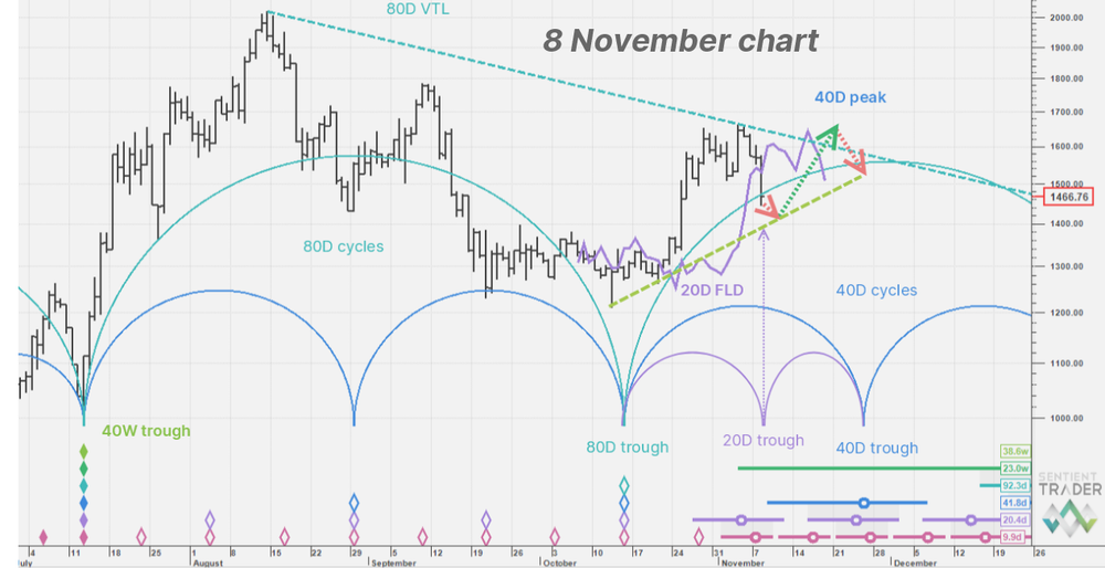 The sharp decline has also reanalysed the cycles and price looks to be at the 40 day cycle trough now and is attempting to stabilise here. However, note that there is a decent shelf just above 1,000 which could act as a near term liquidity magnet 150 odd points lower. The 80 day cycle peak is now confirmed on 4 November and the next trough isn't due until the third week of December.