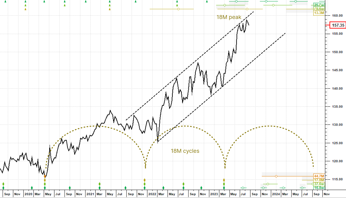 There is a fairly serious looking breakdown underway on the daily chart, so we thought a glance across at the weekly made sense. Price is in an 18 month cycle peak zone, which means that the current 18 month cycle is left translated (early peak) and bearish. Price has also tapped into the top of a clear channel and has started to chop. We advise alertness here as upside is severely limited.
