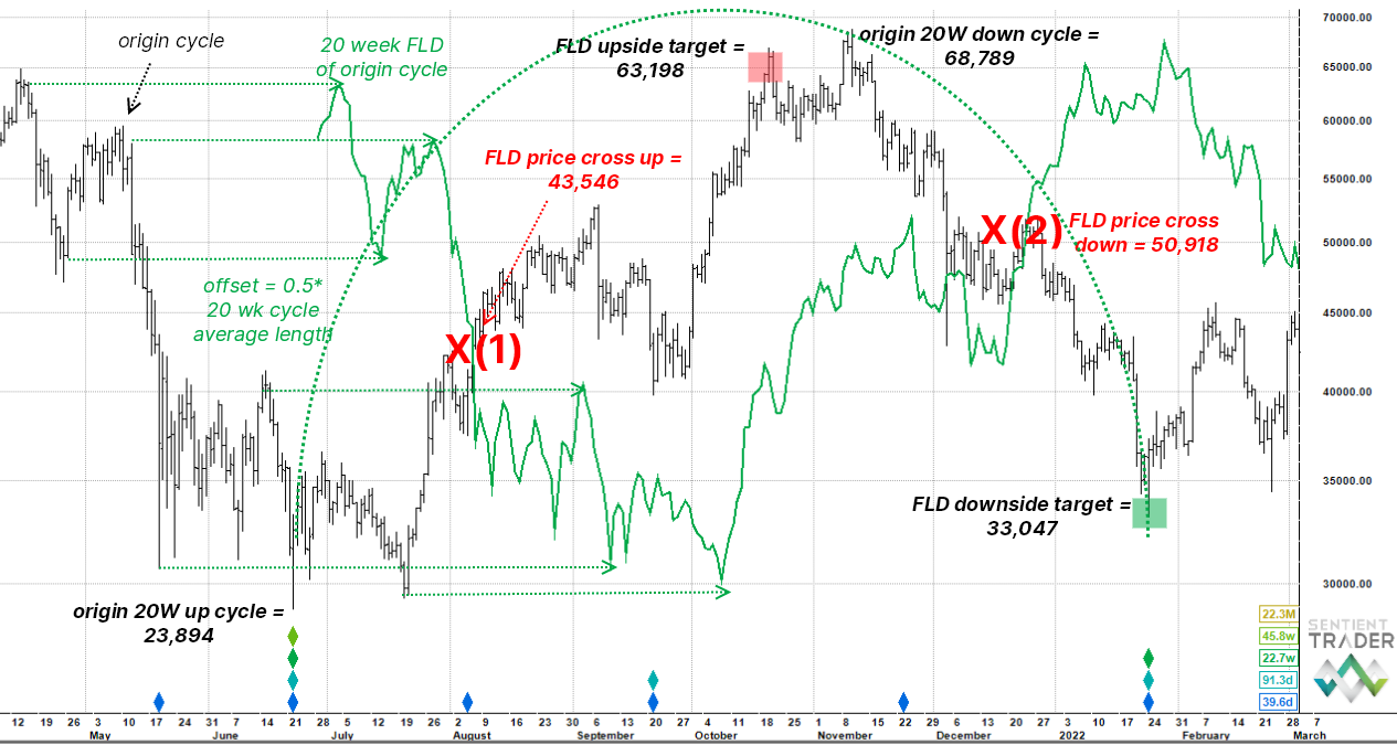 The origin price is the 22 June low of 23,894. Price rallies with the new 20 week cycle and meets the falling 20 week FLD on 7 August at 43,546 X(1). With these two pieces of information, we can now estimate an initial target for the 20 week cycle peak. We do this by subtracting the origin price from the FLD cross price and then adding the difference to the cross price. This generates an upside target of 63,198 which turns out to be 92% of the actual peak price, which came in at 68,789 on 10 November. The reason the FLD projection fell a bit short is covered in the next section.