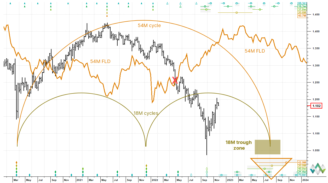 Analysis: two major cycles are heading down: the 54 month cycle and the 18 month cycle. The overarching 54 month cycle - also sometimes called the "business cycle" - is due to bottom next summer. It peaked very early in May 2021, which is very bearish peak left translation. You can view guidance notes on Hurst cycles tools here.