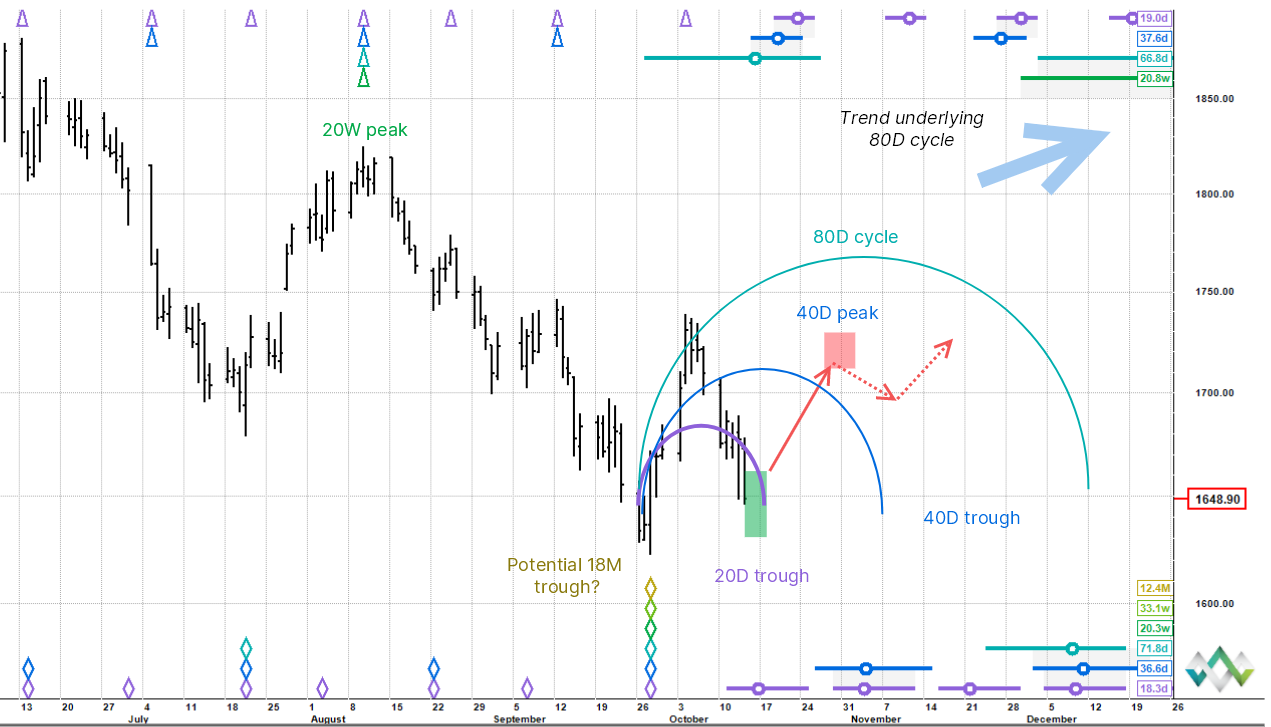 The preferred view is that Gold is just emerging from a major trough put in on 28 September. It could either be that of an 18 month cycle (which was due then) or a 40 week cycle. The exact magnitude is not yet confirmed, but if so either way the message should the same: a meaningful advance could be about to kick in again. We are currently stalking the first 20 day cycle trough, which is due this week and once confirmed should lead to an upswing into the 40 day cycle peak at the end of October - the red arrows describe the potential price path. Alt view: it is still possible that the expected 20 day cycle trough has limited impact on price and we see further downside. The implication here would be that the 18 month cycle low is still slightly ahead of us. We will be monitoring in intra week updates.