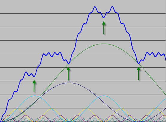 In essence these principles define a theory which describes the movement of a financial market as the combination of an infinite number of “cycles”. These cycles are all harmonically related to one another (their wavelengths are related by small integer values) and their troughs are synchronised where possible, as opposed to their peaks. The principles define exactly how cycles combine to produce a resultant price movement (with an allowance for some randomness and fundamental interaction).