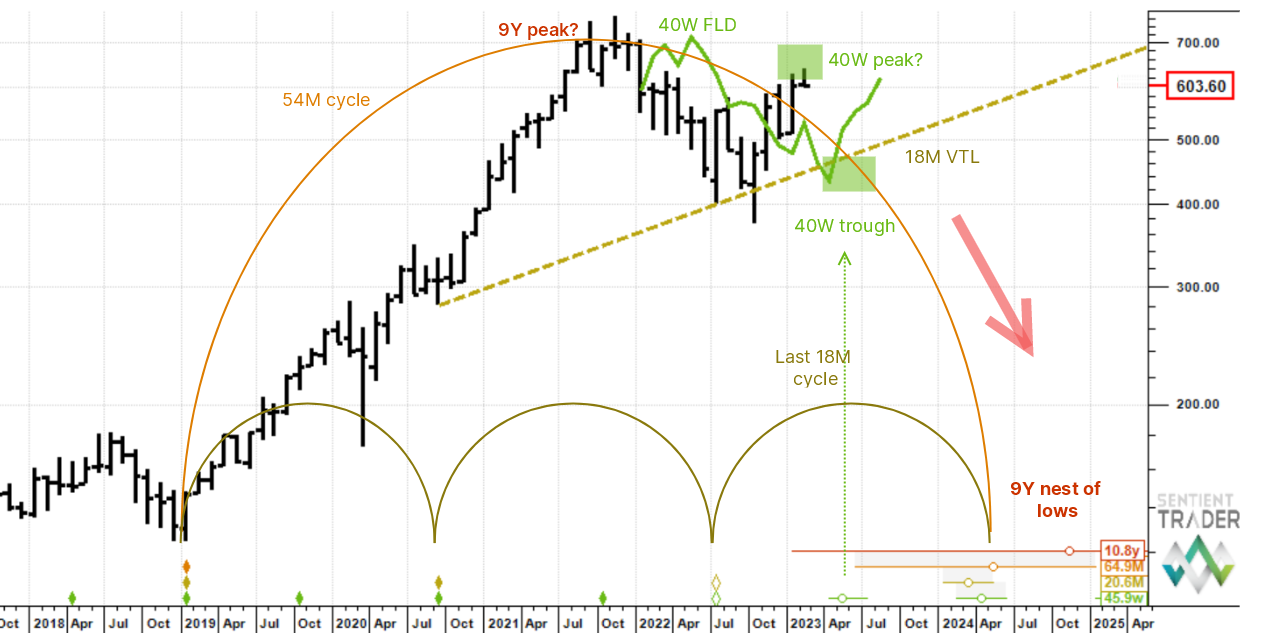 - We are currently stalking the first 40 week cycle peak and expect a decline to below 500 around May (roughly to the 18 month VTL and 40 week FLD). We will update as price unfolds.