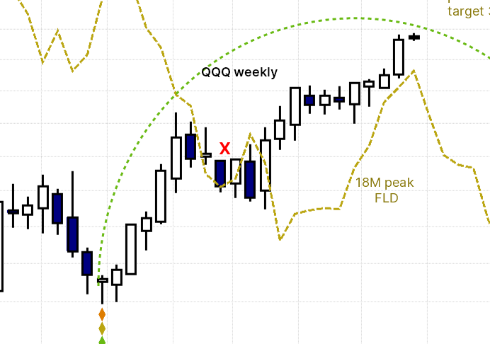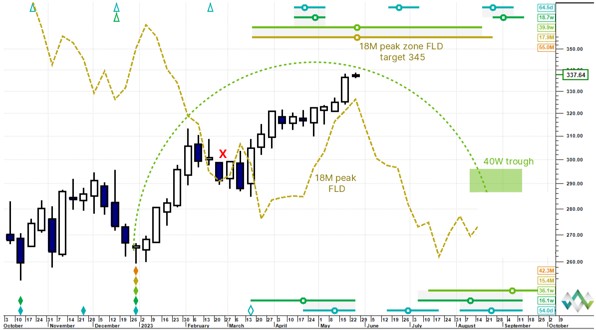 The 18 month cycle peak contains the 40 week cycle peak as well and the arc of this cycle has plotted to its trough around late August. We are expecting a drop to between 290 and 300 by this time, once the current upswing matures into its peak.