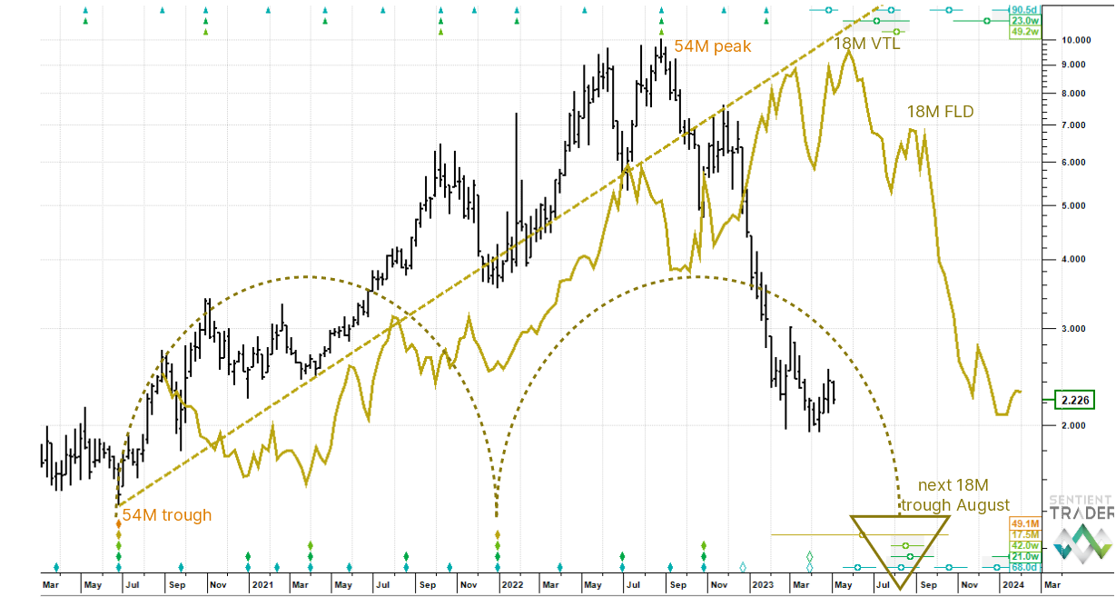 Since the last 18 month cycle trough we had a major peak (last August) and the down cross of the 18 month cycle VTL makes it a 54 month cycle peak. This is the longest cycle we look at and has a lot of power. It's why the downtrend has been so strong.