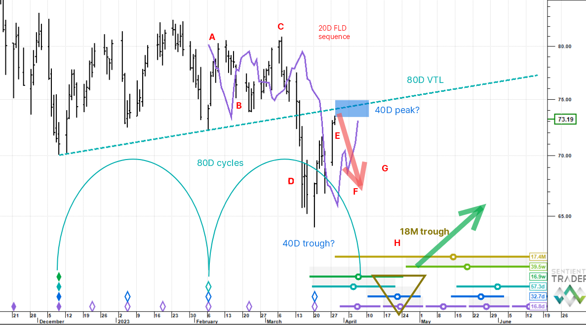 - Price has just passed up through the 20 day FLD which projects to just under 75, which is also where the 80 day VTL (valid trend-line) sits. This line broke down a few weeks ago and is a natural magnet for a return trip. It should also serve as resistance and we think a top out here will be an early (left translated 40 day cycle peak). The next 40 day cycle trough should coincide with the major trough in the 18 month cycle nest of lows. So the call is DOWN.