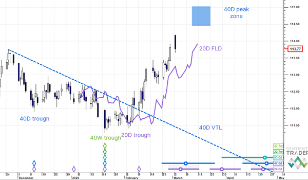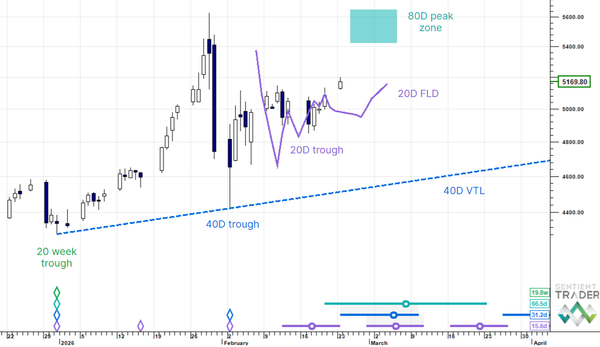 US Dollar Down (->40D trough). Gold Up (->80D peak). Oil Up (->80D peak). Copper Up (->40D peak). USDJPY Down (->20 day trough). EURUSD Down (->40D trough). SPX E-minis Down (-> 40D trough). Nikkei Down (->80D trough). Bitcoin (20D trough). Ten Year Notes Up (->40D peak). ...