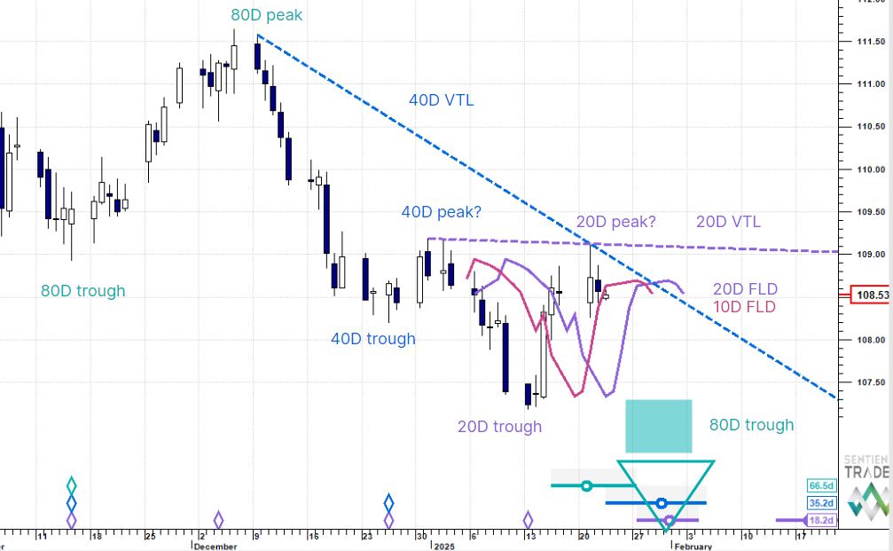 Cycle action has been unclear in the extended move down recently, but we now have some key levels provided by FLDs to provide clues to the timing of the next 80 day cycle trough.