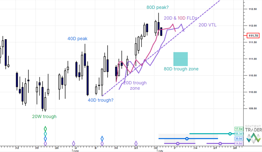 As we monitor the US Dollar for an 80 day cycle trough, 10 Year Treasury Futures are forming an 80 day cycle peak.