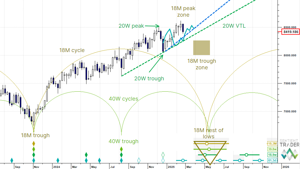 ASX 200 (Australian index) futures - long term entering an 18 month cycle peak zone; near term looking for a counter-trend 80 day cycle bounce and fade.