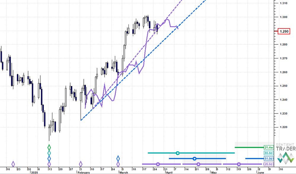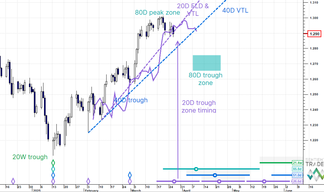 We last wrote on Cable on 18 February and were looking for a price expansion into the 40 day cycle peak around 1.284 (with a potential for an overshoot) in the second week of March. This panned out accurately with the only proviso being that we think that the peak is 80 day cycle magnitude now.