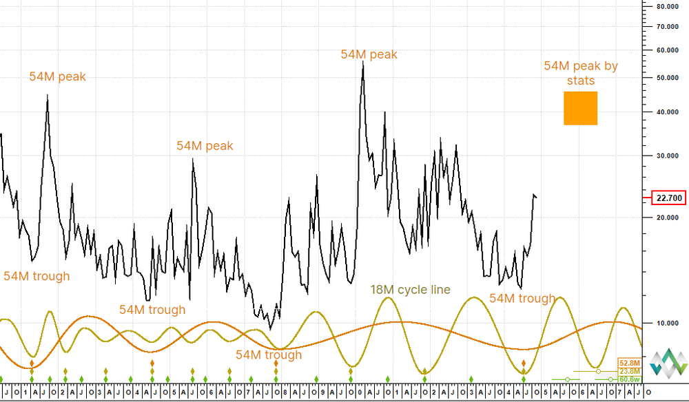 The monthly line log chart here is regular and shows stable rhythm, although the last 54 month cycle period was lengthened. The VIX shows the expected volatility of the S&P500 Index (SPX). When VIX rises SPX gets more volatile and moves (either up or down). The analysis shows that the July low was at least a 54 month cycle trough, which implies that a long term uptrend is in place now. There isn't much data to go on in the chart, but the average rally out of the 54 month cycle trough is 338% and the average trough to peak time duration is 540 days. This tiny sample gives us a 54 month cycle target of around 40 in January 2026. Make of that what you will. Here is the daily chart: