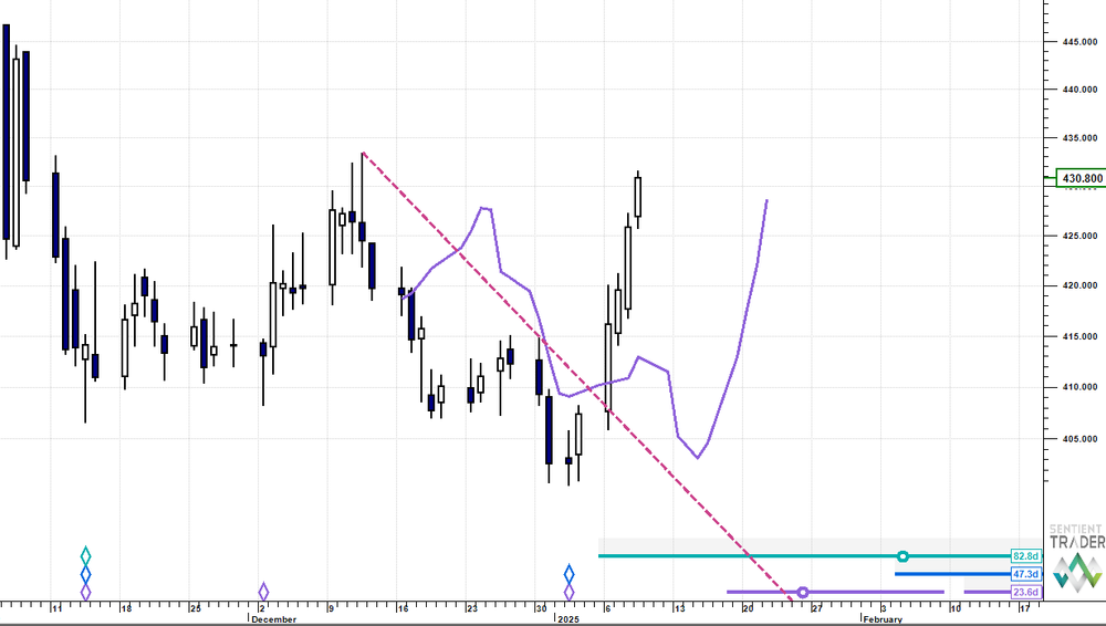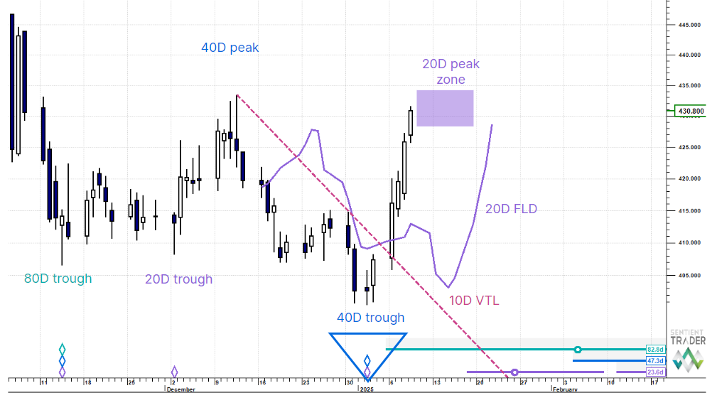 The 40 day cycle troughed and the upswing of the new cycle has taken price up through the 20 day FLD to the 20 day cycle peak price target box in Monday's Macro Outlook (circa 430).
