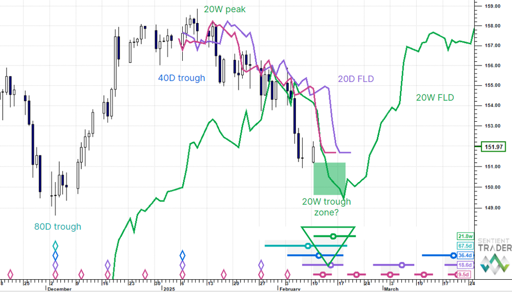 At the moment the cycles are very choppy and convey little. Copper looks to be in a 40 day cycle peak zone and Gold looks to be closing on a big top (the 20 week cycle peak). SPX futures look heavy near term but are consolidating in our view. The Japanese yen could be in a key low zone readying for a move higher and yen short regime. We are deferring judgment on the Nikkei until we get resolution in USDJPY. Bitcoin has found its 20 day cycle trough and should start moving higher again.