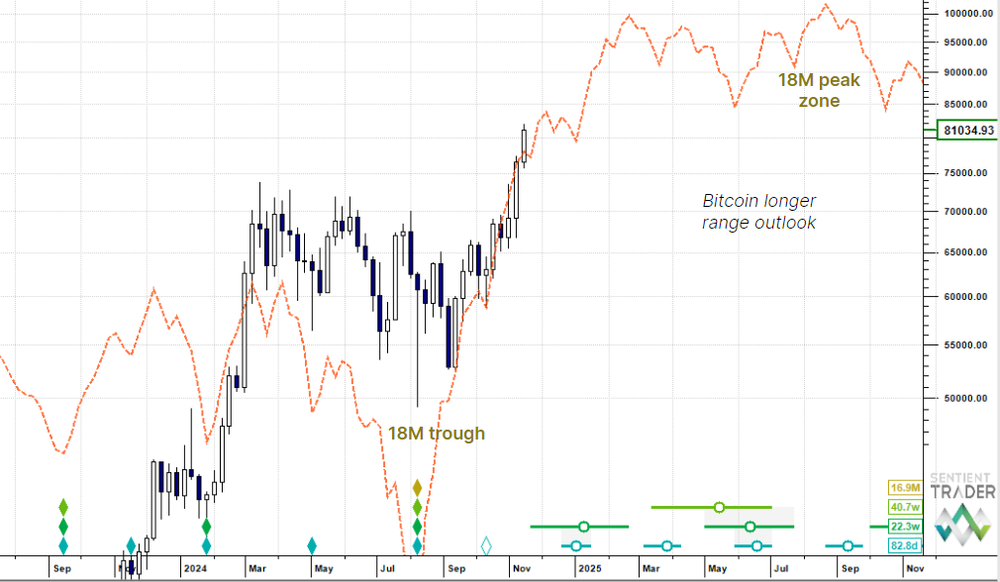 Post the US Presidential election US equities, Bitcoin and the Dollar have continued to push. Gold is languishing, but nearing a trough zone and the broader outlook for the Euro remains down.