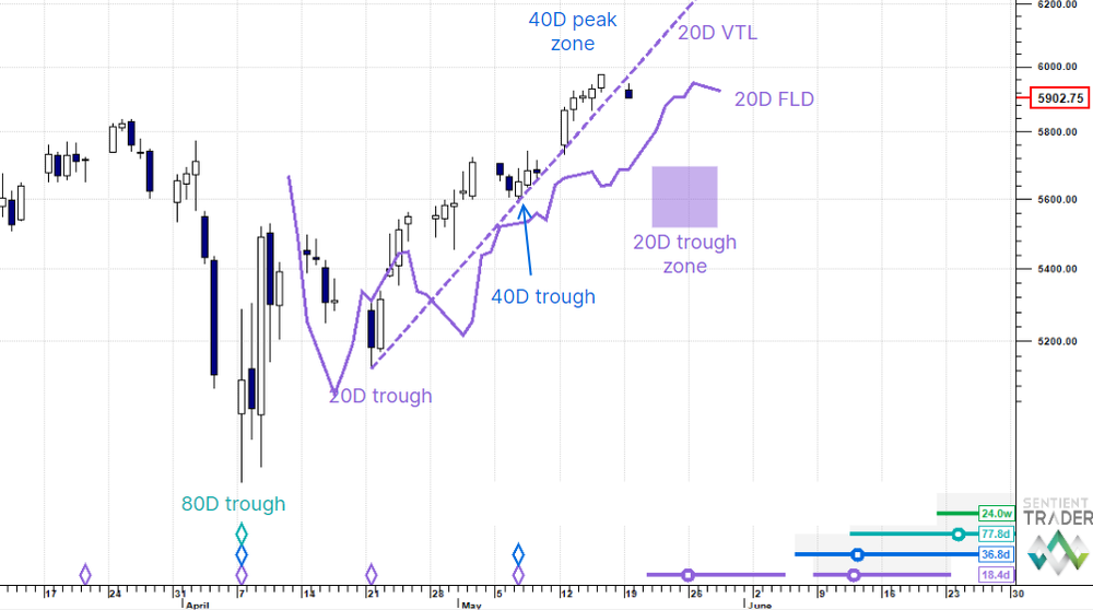 S&P 500 futures just topped at 40 day cycle magnitude along with Nikkei futures and potentially Bitcoin. At this stage we are not looking for meaningful resets lower. The US Dollar is still constructive in our view and is merely looking for the first 40 day cycle trough at the moment. Oil looks to have more upside, however Copper is flaccid.