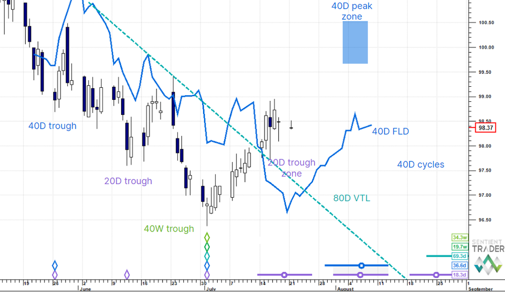 We will hold off on S&P500 E-minis (ES). We need a little more price action to evaluate the 80 day cycle peak zone test we have been looking at last week.