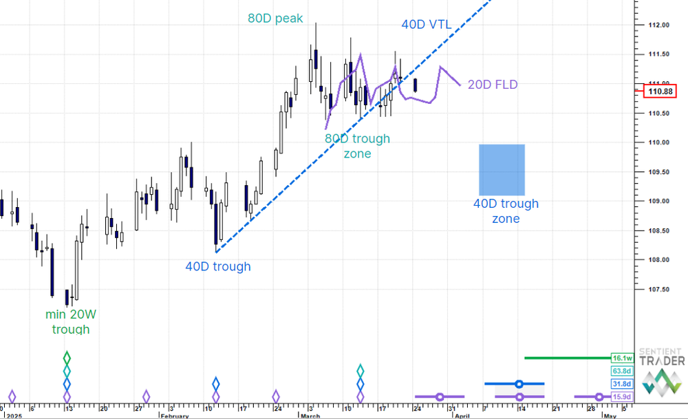 A macro rotation has begun with Treasury notes having topped out at 80 day degree cycle magnitude, the Dollar and Yen potentially round 20 week cycle troughs and major equity indices and Bitcoin in new 80 day cycle upswings. Gold and Copper remain unconfirmed as yet and as such call for a little more caution.