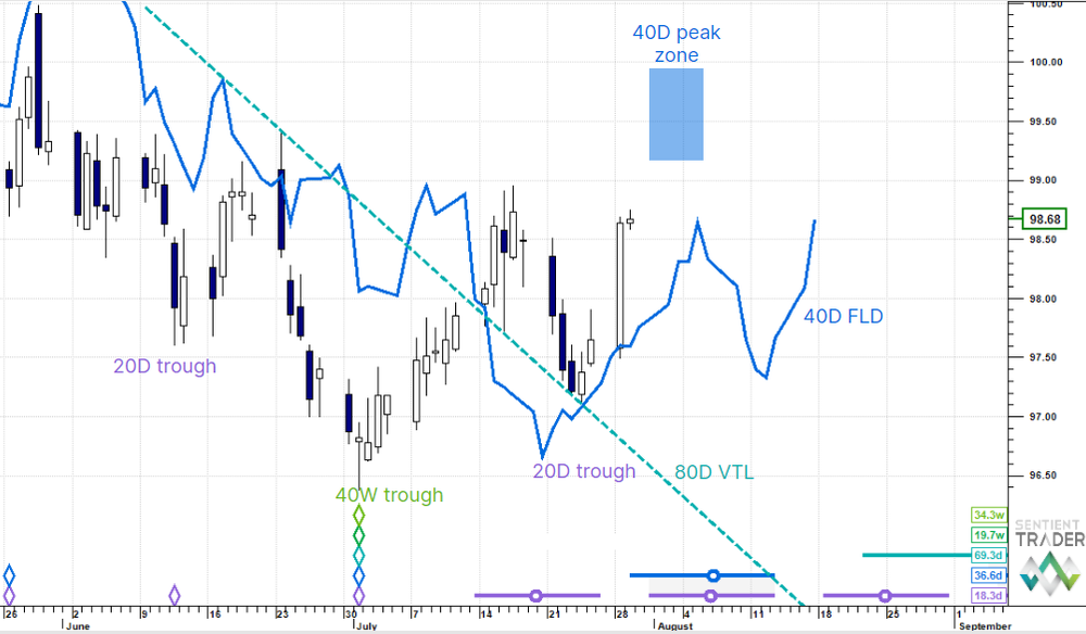 The US Dollar has regained the longer uptrend in force. Gold is falling towards next 80 day trough. Oil and Copper are heavy. JPY approaching a 40 day peak. EUR collapsed out of an early 80 day peak. SPX 80 day peak zone. NKY already passed one. Bitcoin trying to base at 40 day trough.