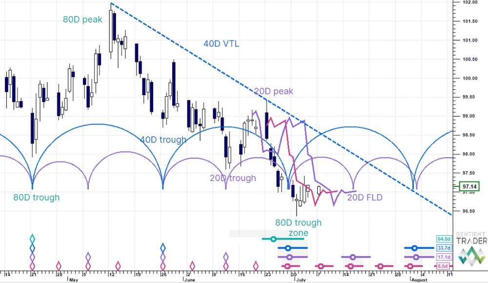 The US Dollar and JPY look to have turned a corner. ES is due a reset but the overall price path is ever higher. Bitcoin as well. Copper just put in an 80 day cycle peak and Oil is falling towards its next 40 day cycle trough.