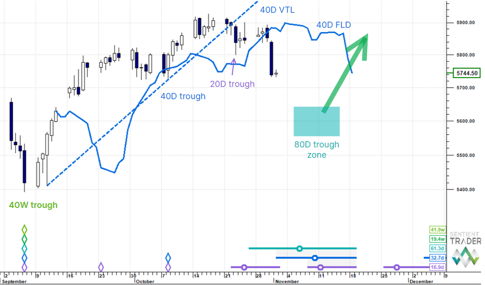 The call in Monday's macro outlook needs revision. The 80 day cycle has peaked and we are projecting down to around 5,600 - 5,650 for the next 80 day cycle trough from next week onwards, centering around 11 November.