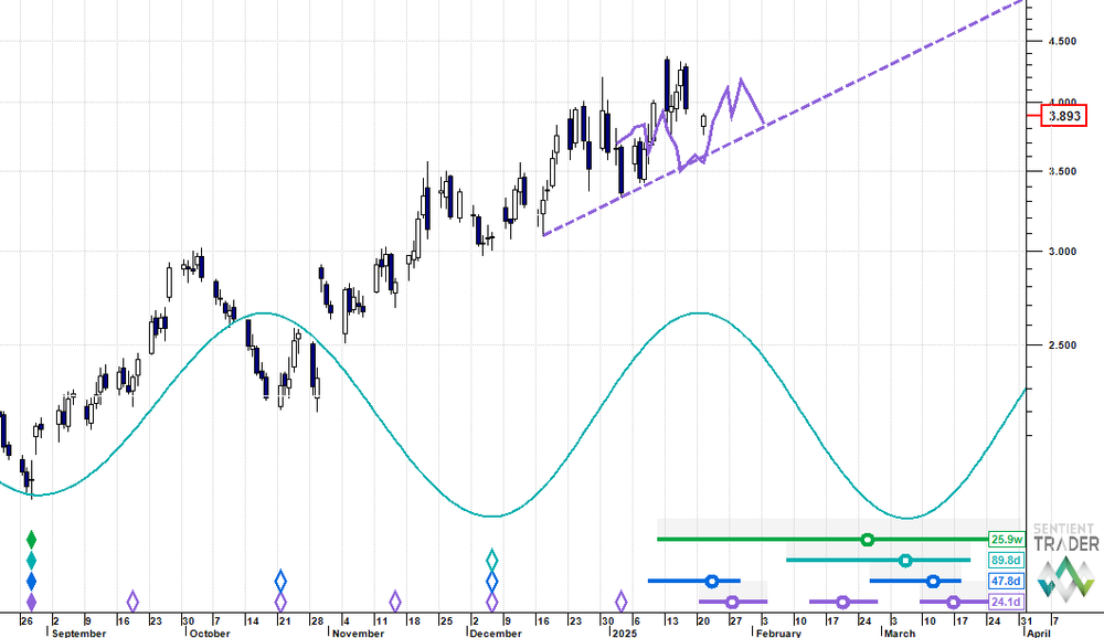 Price could be falling out of a 20 week cycle peak although this is not confirmed. The next 20 week cycle trough is expected from early to mid-March.