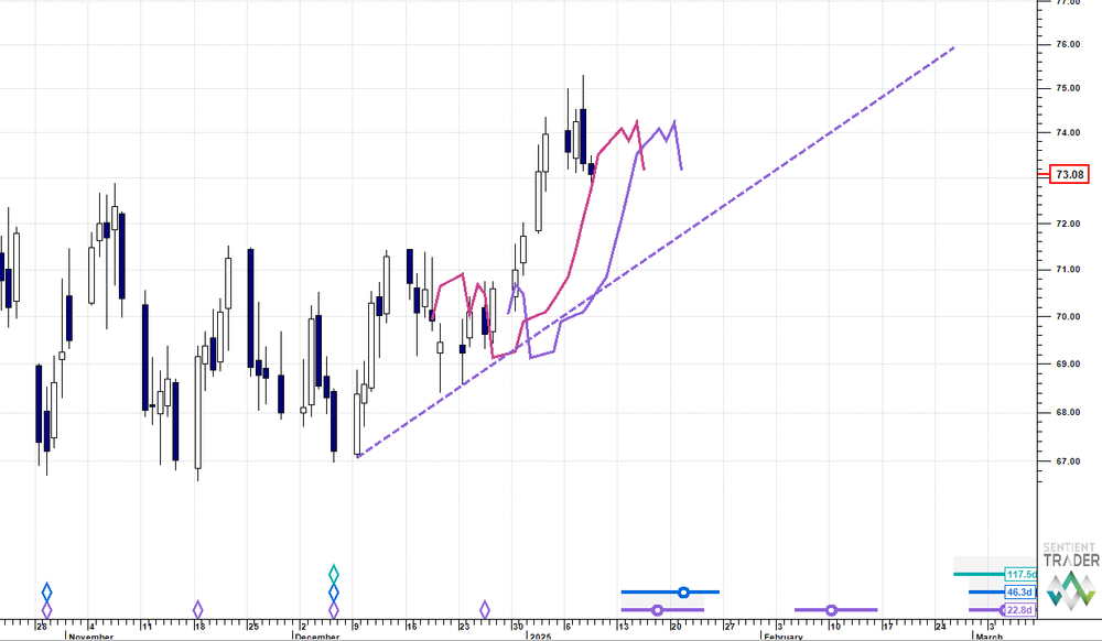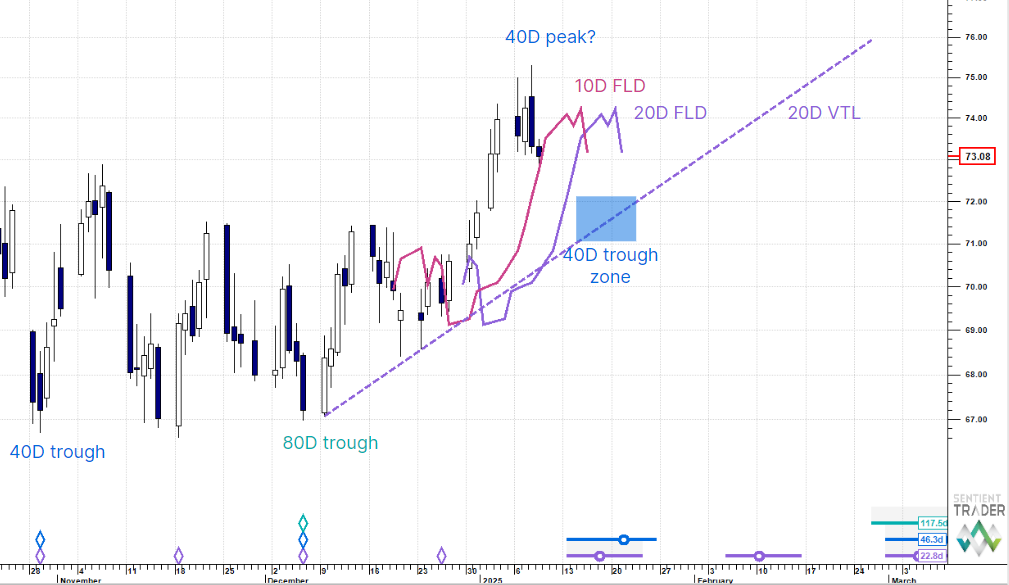 In Monday's Macro Outlook the belief was that we were entering the 40 day cycle peak zone with the target from the 20 day FLD projection being circa 74.