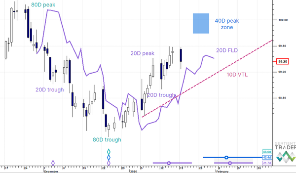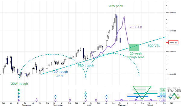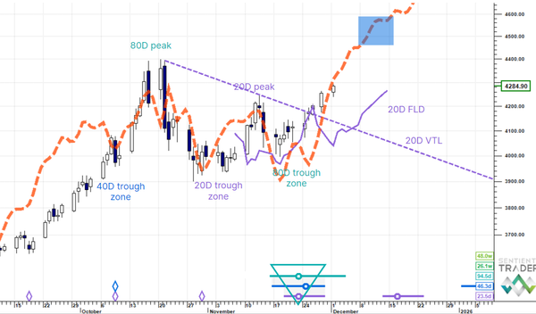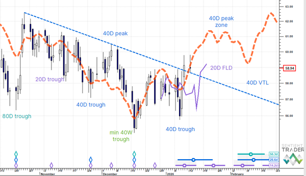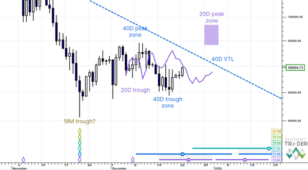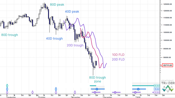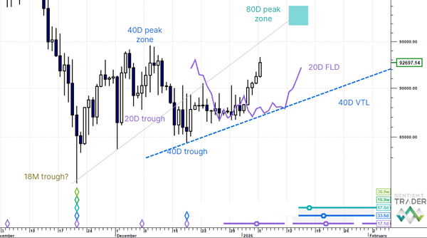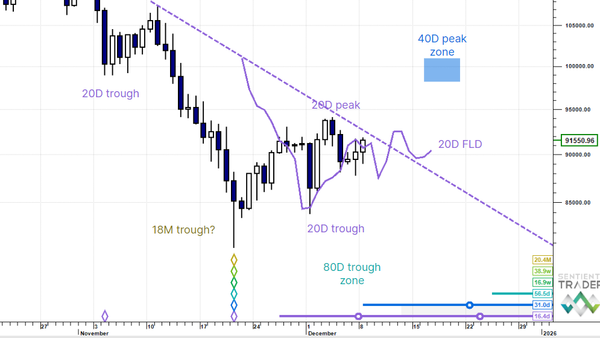 US Dollar Up (20W trough). Gold SmallUp to Down(20D trough). Oil Down (->40D trough). Copper Up (80D trough). EURUSD Up (->40D peak). SPX E-minis SmallDown (-> 20D trough). Nikkei Down (-> 20D trough). Bitcoin Down (-80D trough). Ten Year Notes Up (->40D peak). ...