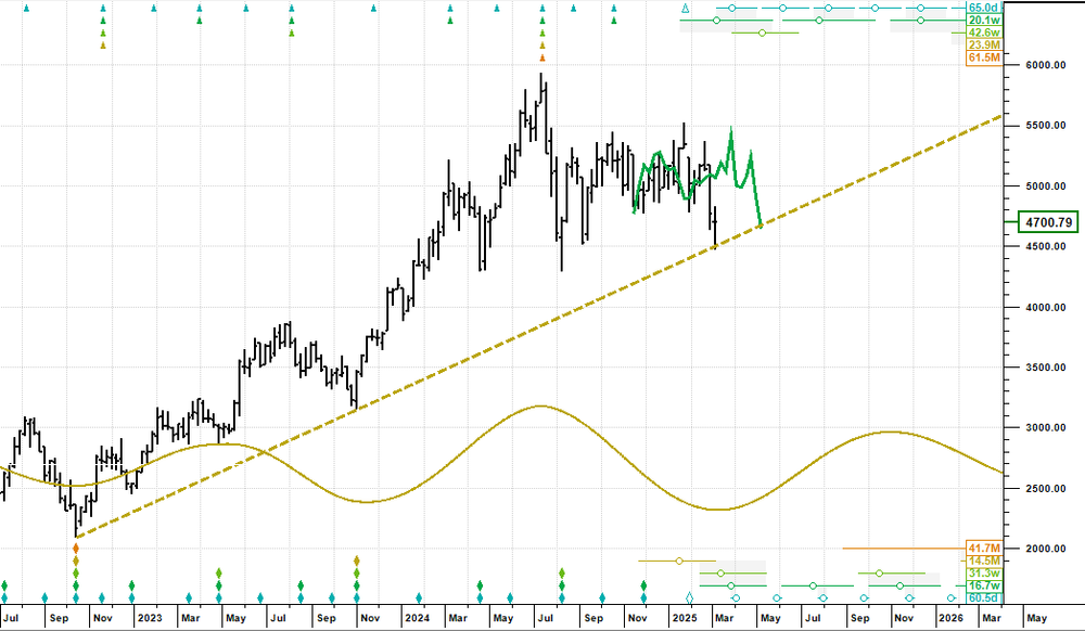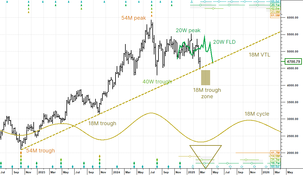 We last wrote on SOX Index on 20 February looking for a 40 day cycle peak, which came and went on cue. In fact it turned out to be the last 80 day cycle peak in the current 18 month cycle and price has been falling ever since.