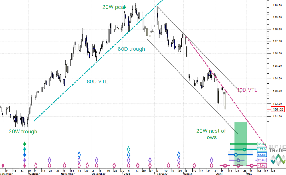 The sudden down check in DXY in today's session makes us question the analysis from Monday's macro note (i.e. testing an 80 day cycle trough). In this update we consider a revised analysis.
