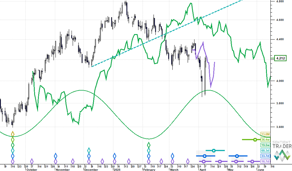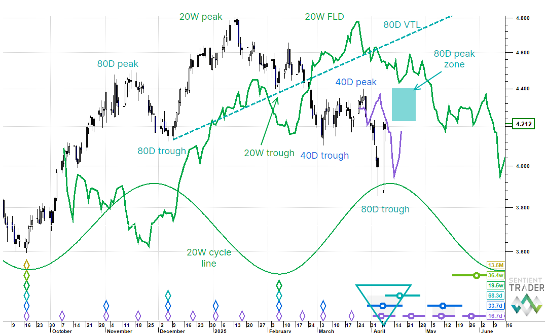 Price has bounced hard out of an obvious 80 day cycle trough zone. However, this is the second of two 80 day cycles out of a new 20 week cycle which last bottomed in early February. As you can see from the chart, however, the 80 day cycle trough is a long way below the last 20 week cycle trough.