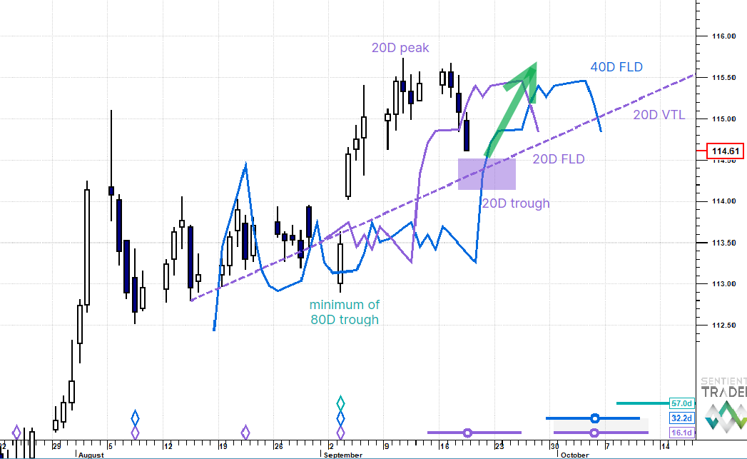 Yesterday's down cross of the 20 day FLD confirms that the recent peak was that of a 20 day cycle and we are now very close to a 20 day cycle trough. We expect this around the intersection of the 40 day FLD and 20 day up-sloping VTL.
