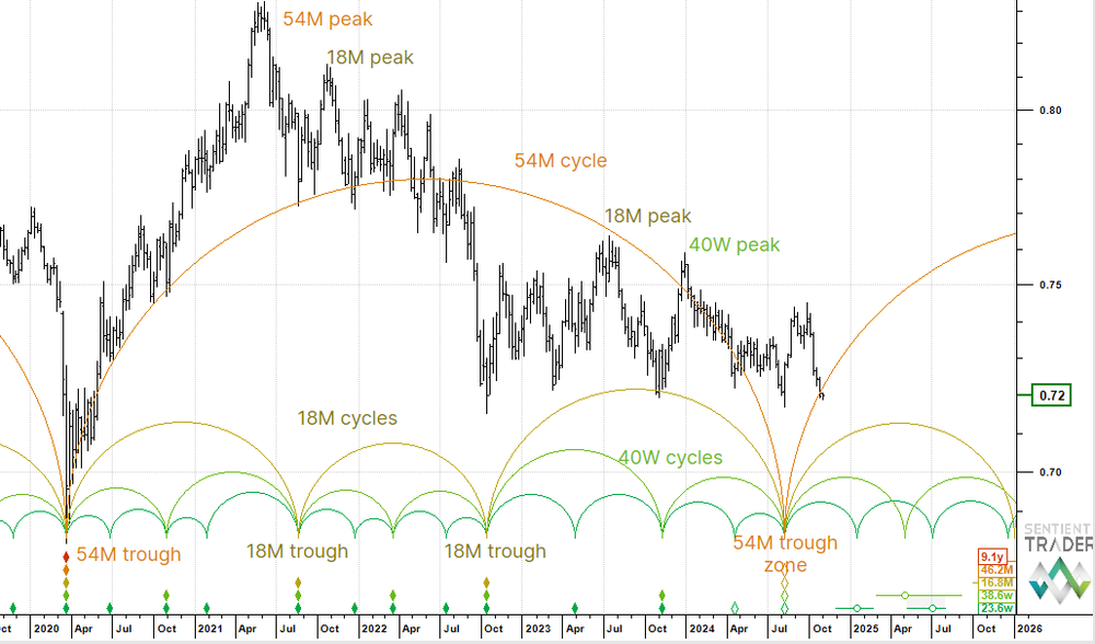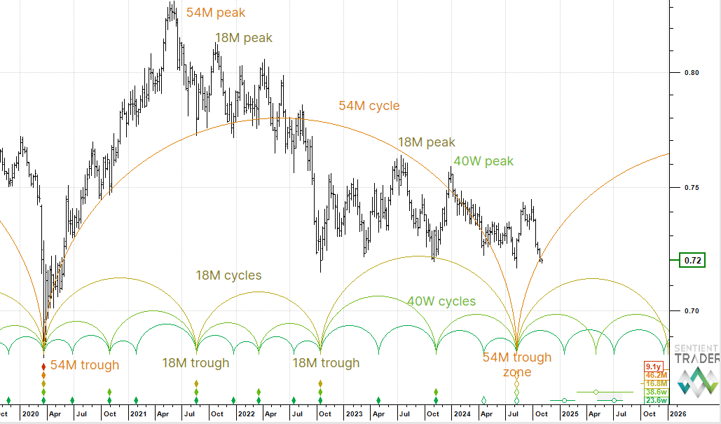 The weekly chart here shows the full rotation of a 54 month cycle and the phasing analysis suggests early August as the last trough. This implies that we are at the start of a new meaningful uptrend. However, it is not inconceivable that the actual 54 month cycle trough is pushed forward in time and the stack of trough diamonds shifts. Nevertheless, it is worth looking at because an opportunity at the shorter cycles degree may be presenting itself. Here is the daily chart: