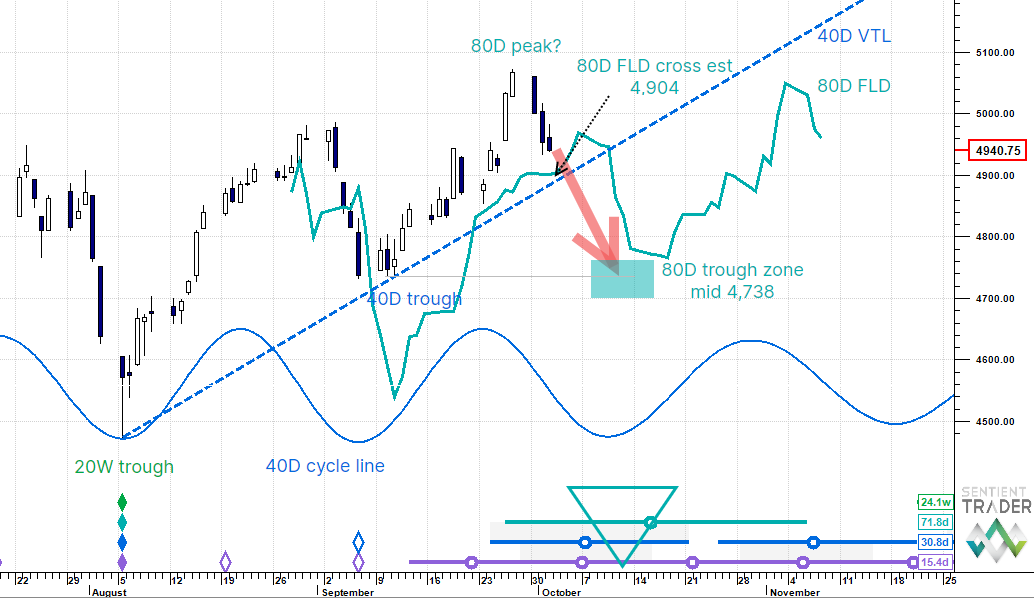 Eurostoxx is at a crux point. A sharp drawdown, similar to that of most major equity indices, has just posted and we are now hovering just above the 80 day FLD and the upsloping 40 day VTL. We need one of these to be broken down by price to confirm that the 27 September high is the 80 day cycle peak.