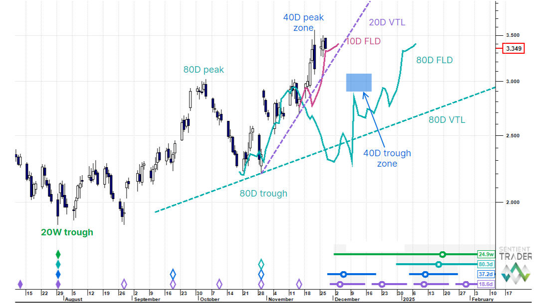 Natural Gas has rallied well from the end October 80 day cycle trough and the 80 day FLD up-cross in mid-November targets 3.23 versus current price of 3.34. We are looking for a 40 day cycle peak around current levels and then a pullback.