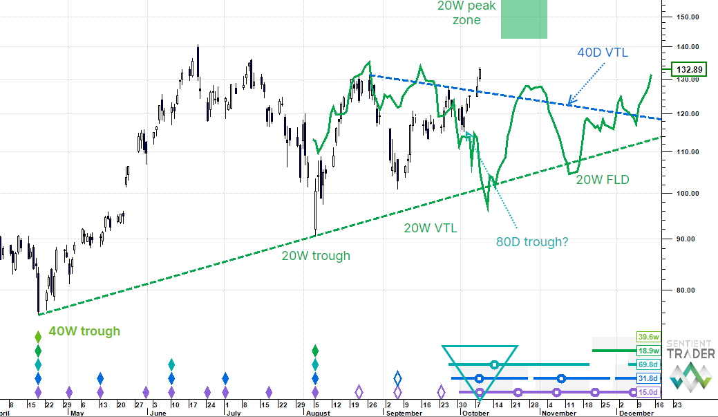 Tech heavyweight NVIDIA has around a 90% correlation with SOX and until this week the same for Nasdaq (currently this week correlation is 37%, so it has decoupled). Underpinning the broad uptrend is the rising 40 week cycle which however is actually nearly 25 weeks along (or 62% of the average wavelength).