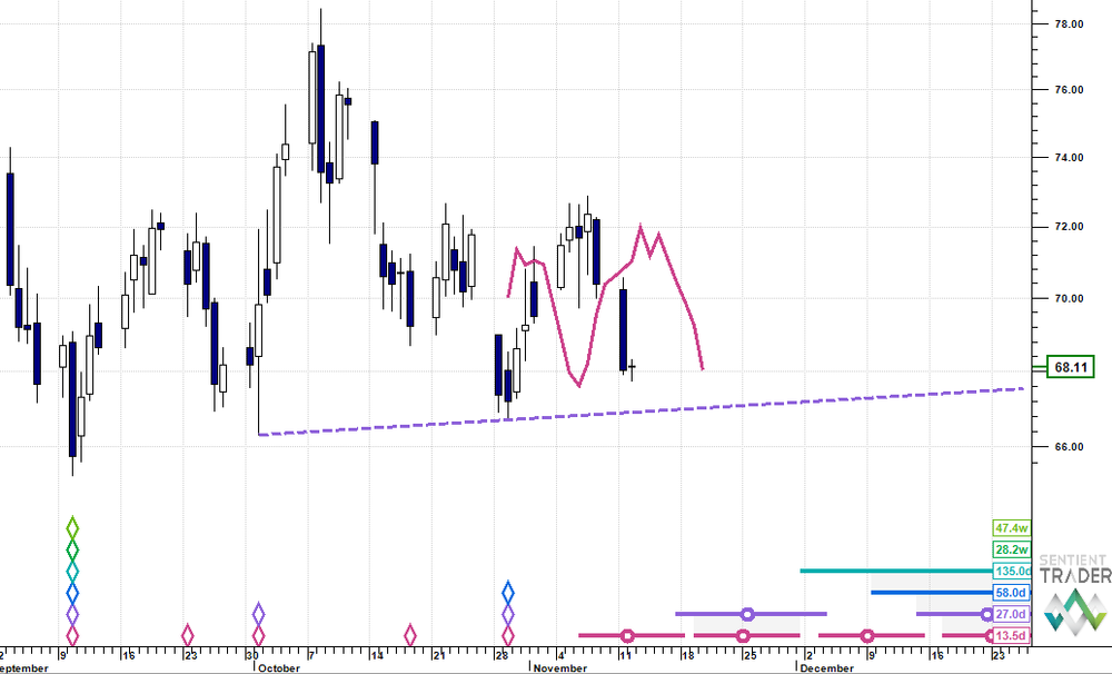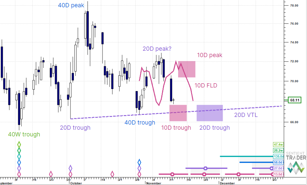 In Monday's Macro Outlook, we were looking for a push higher towards the 20 day cycle peak, potentially around 75. However, price failed to follow through and has sharply declined towards the 20 day VTL and into the 10 day cycle trough zone.
