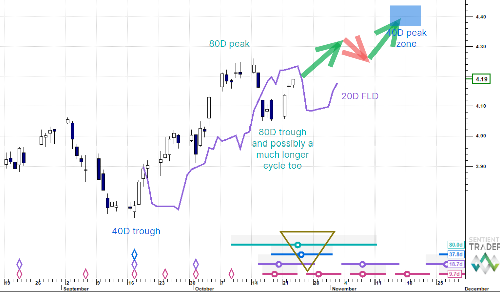 UK 10 year gilts - expanding towards the next 40 day cycle peak.