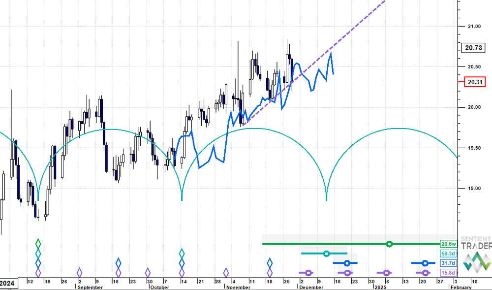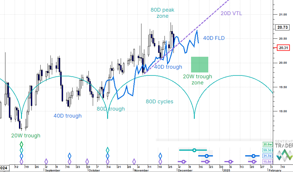We last wrote on USDMXN on 10 October looking for a price extension above 20 for a 40 day cycle peak. Price achieved the target at the end of last month and since then has been through a correction and pushed higher. We believe that the 80 day cycle peak is now in place.