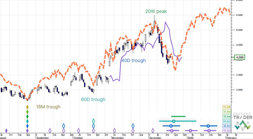 We likely have one short leg down into the 20 week cycle trough. It is pro-trend because the 18 month cycle trough is still rising.