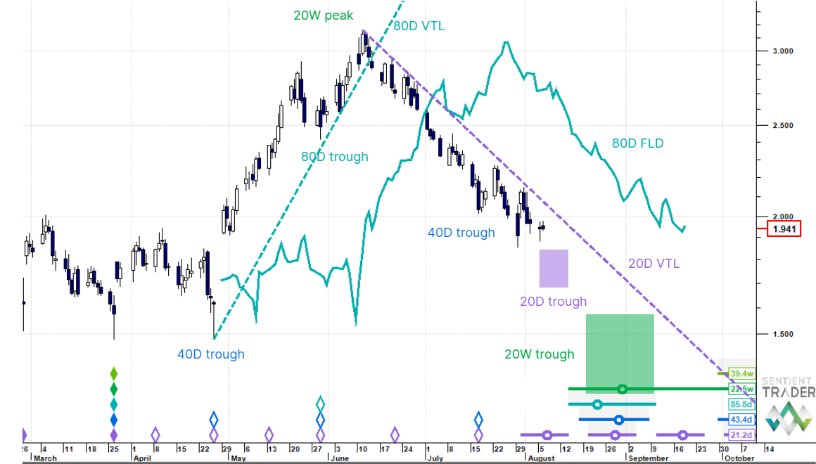 Price is running along the downswing of a 20 week cycle which peaked mid June. The downtrend is pronounced with strong momentum and technically not oversold yet, meaning there is downside room to breathe. Notice that the 40 day cycle peak didn't even penetrate the 20 day VTL and although we are expecting a 20 day cycle trough any time now, we expect the rally to be very muted and fail early. Looming large at the end of the month and drawing price down into it is the 20 week cycle low. The rough target is under 1.5 for now, corresponding to the double bottom back in April.